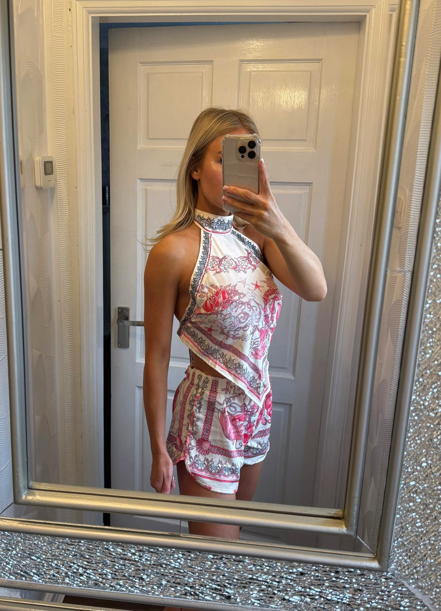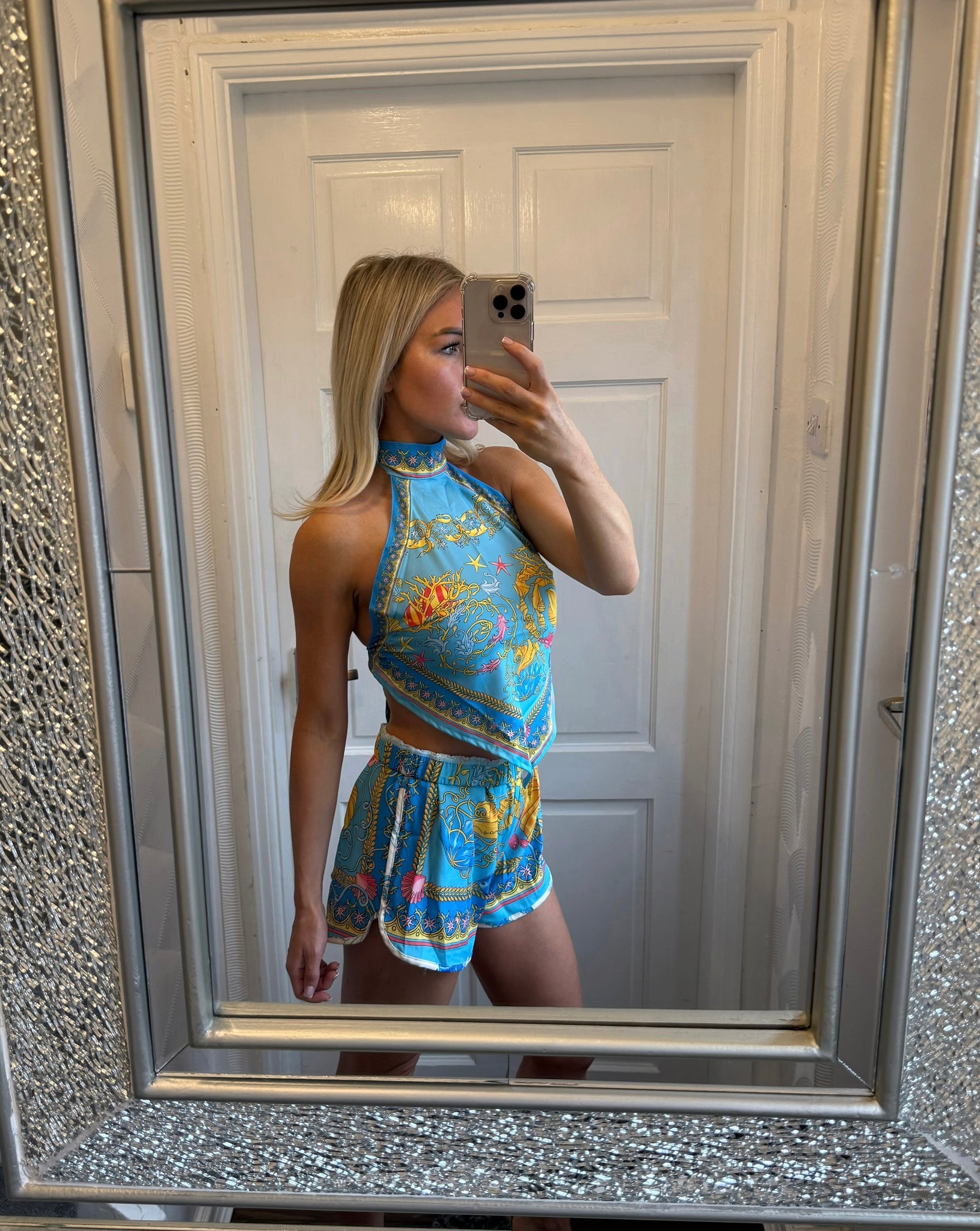 Silk material halter neck top & elasticated waist shorts perfect for your summer holidays!