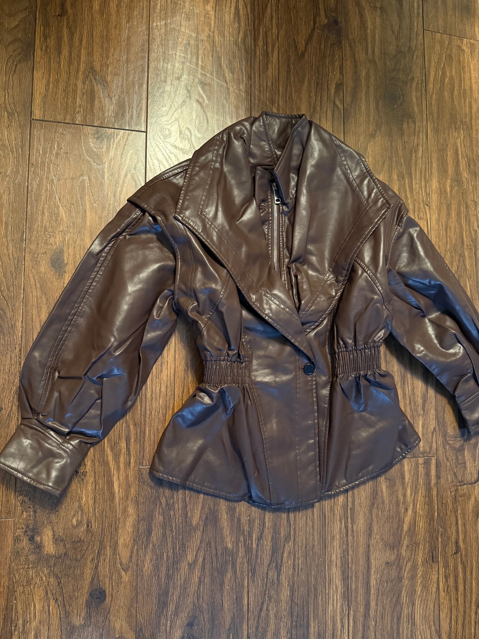 Layered brown leather jacket with zip up festival and button fasten over top layer, cinched waist with a peplum style fit! Perfect autumn winter jacket and on so on trend!