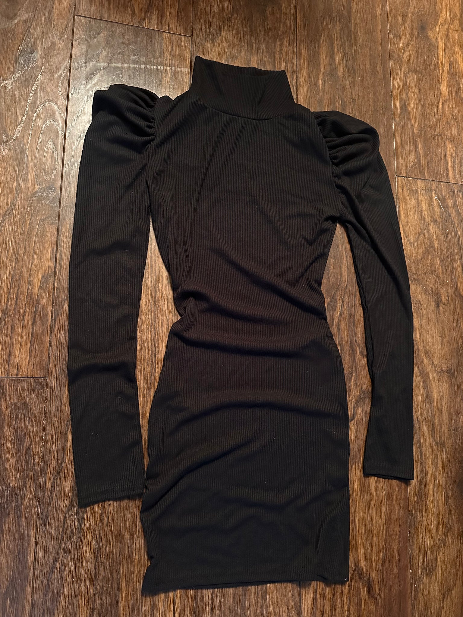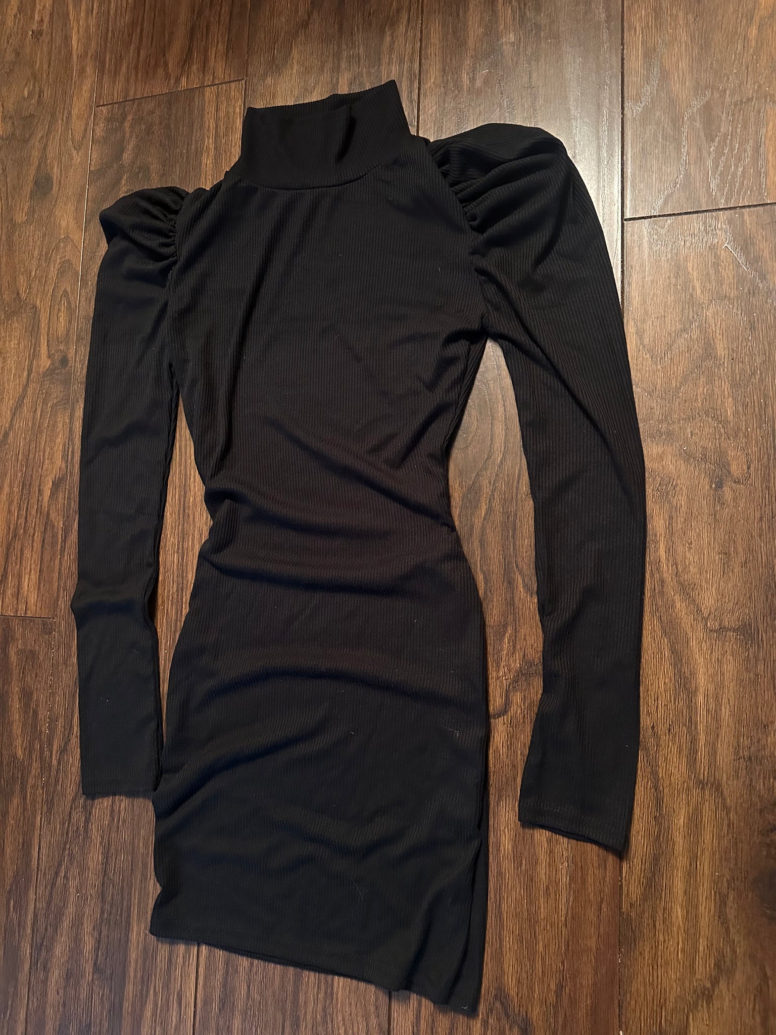Fitted ribbed mini dress with roll neck & puff shoulders.