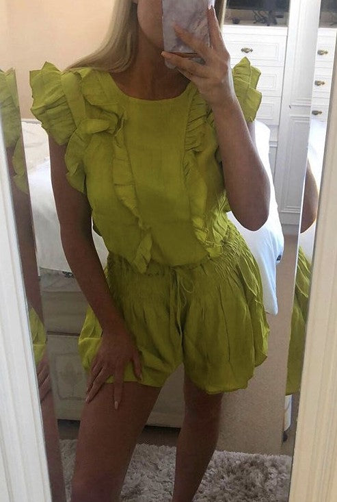 Lime two piece linen suit can be worn tucked in or out as seen in pictures.